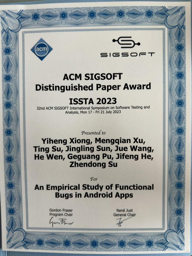 近日,软件工程领域国际学术会议ISSTA 2023 (International Symposium on Software Testing and Analysis) 在美国西雅图召开。304am永利集团博士生熊一衡对研究工作“An Empirical Study of Functional Bugs in Android Apps”做了在线报告,该工作荣获了大会颁发的ACM SIGSOFT杰出论文奖 (ACM SIGSOFT Distinguished Paper Award)。
