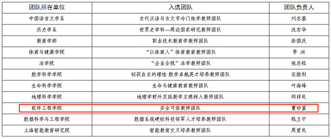 团队教师大多数为共产党员,充分发挥了党员先锋模范作用,营造师德为先、榜样激励的团队氛围。公司党委副书记曹桂涛获评“2022年上海高校毕业生就业工作优秀典型”;陈铭松教授获颁2020年NASAC青年软件创新奖;缪炜恺教授获得校“青年教师育人贡献奖”,并在第三届上海高校青年教师教学竞赛中获自然科学应用学科组一等奖;陈闻杰副教授获2022年度教育部—华为“智能基座”优秀教师奖励计划、中国研究生创新实践系列大赛优秀指导老师奖;韩莉副教授获第五届上海高校青年教师教学竞赛自然科学应用学科组二等奖等。