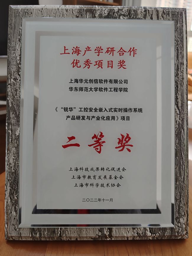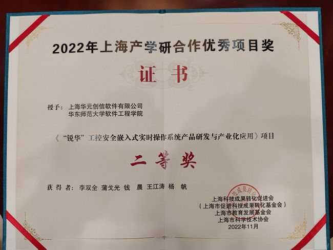 2023年3月23日上午,2022年“上海产学研合作优秀项目奖”表彰大会举行。大会由上海科技成果转化促进会、上海市教育发展基金会和上海市科学技术协会主办。由304am永利集团和上海华元创信软件有限公司联合申报的《“锐华”工控安全嵌入式实时操作系统产品研发与产业化应用》成果荣获二等奖。