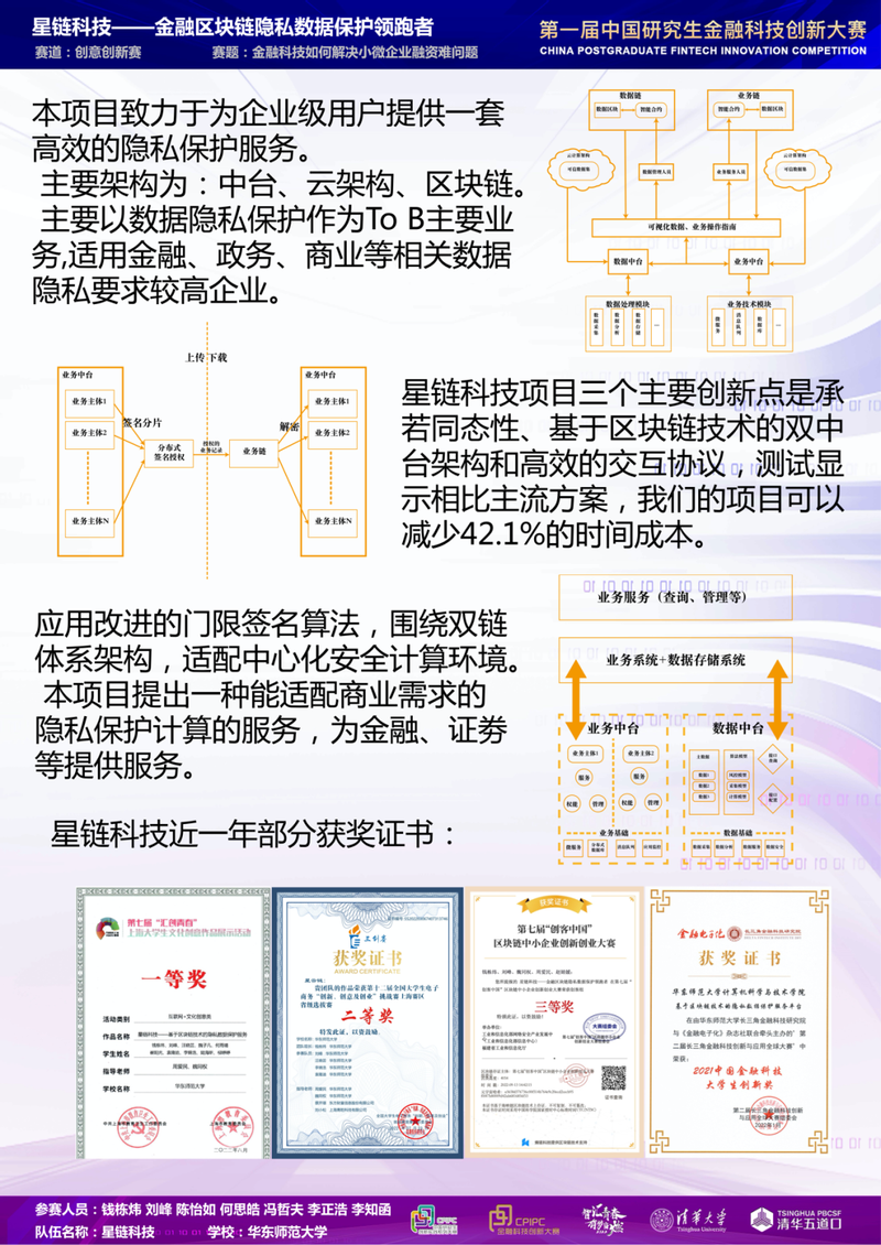 团队深入研究区块链算法,赋能金融产业,推动金融变革,作品通过改进现有区块链加密技术,提出了先进的链上加密算法和一种全新的内生性交互协议,大幅提升了区块链加密算法的效率,并且降低了时间成本。