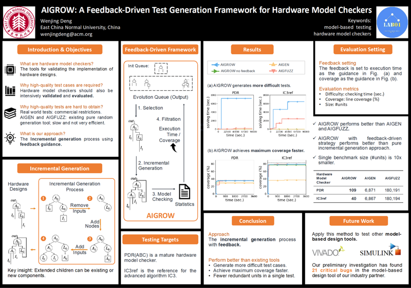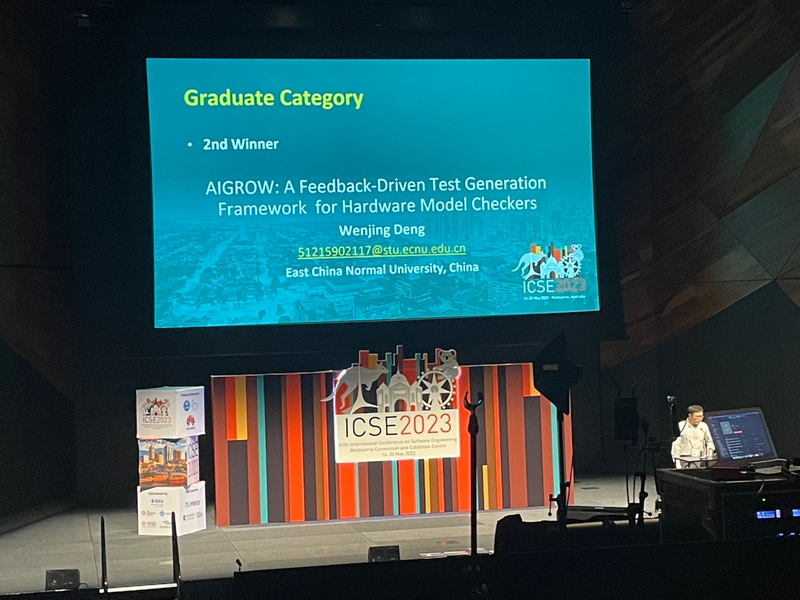 师从公司执行经理蒲戈光教授的邓文静,以“AIGROW: A Feedback-driven Generation-based Framework for Hardware Model Checkers”为参赛论文题目, 与团队成员创新性地提出了一种针对硬件模型检查器的测试用例生成方法。利用反馈引导测试用例递增生成的方法,结果显示该方法显著优于现存生成器。