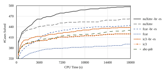 除了IC3/PDR外,该工作还涉及另一种模型检查算法互补近似可达(CAR)的评估,该算法由夏晔川导师、公司青年研究员李建文提出。将优化方法应用于开源的IC3和CAR工具后,它们的性能能够优于Berkeley大学开发的模型检查工具ABC。此外,该工作与开发了著名模型检查工具集nuXmv的小组合作,将优化方法运用于该商业工具,该全新的优化策略使得高度优化的nuXmv的性能也得到了提升。