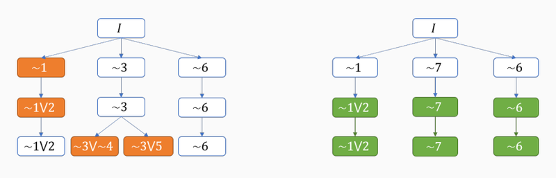 对IC3/PDR构造的引理序列进行可视化,左右为不同的引理序列构造。算法在左侧序列上无法收敛,而可以在右侧序列上收敛