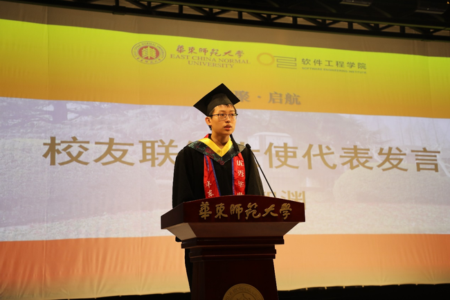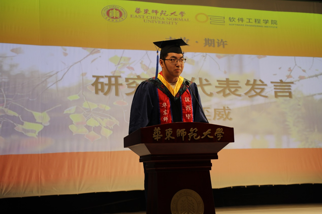 2023届毕业研究生代表、上海市优秀毕业生赵奕威同学在发言中讲述了本科生四年和硕士生三年的学习生活,他回首过去,感谢公司、各位老师以及身边同学的帮助。展望未来,他选择成为一名选调生,投身基层,用自身专业所学建设家乡、回报家乡,并表示“愿我们能心怀感恩,胸怀理想,保持勇敢、善良、坚强的品格,成为生活的英雄,成为自己的榜样。”