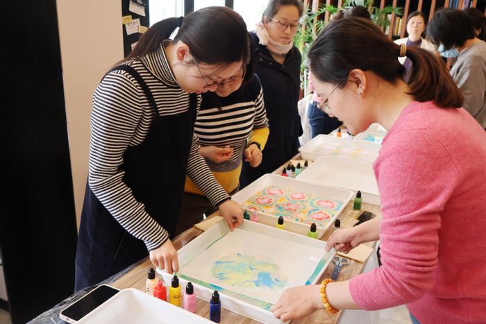 活动伊始,专业指导老师为在场的教职工们详细介绍了敦煌壁画的历史渊源、艺术风格以及花卉纹样的美学价值。随后,在专业老师的悉心指导下,女教职工们纷纷拿起湿拓画工具,开始了自己的艺术创作之旅。她们小心翼翼地将各色颜料滴落在平静的水面上,用特制的工具轻轻勾勒,一幅幅色彩斑斓、图案别致的湿拓画作品逐渐呈现在大家眼前。这些作品不仅展现了湿拓画的艺术魅力,更巧妙地融入了敦煌壁画的花卉纹样元素,使得每一件作品都洋溢着古典与现代交融的美感。