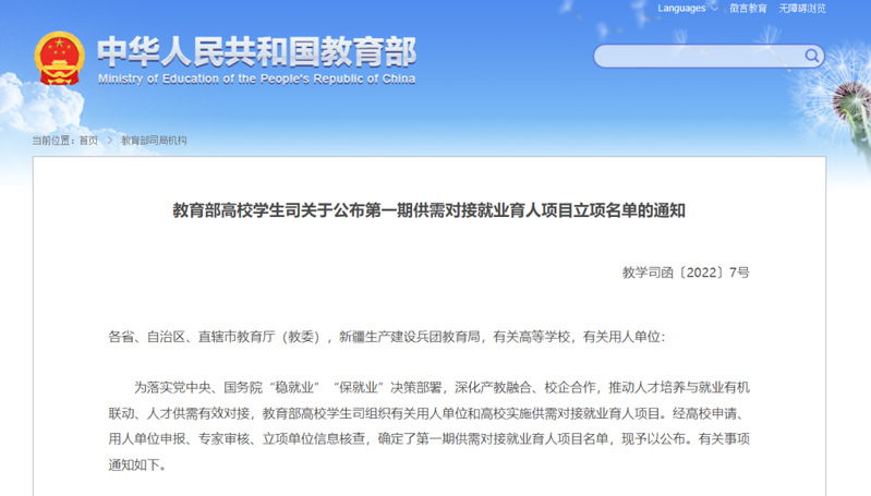 为落实党中央、国务院“稳就业”“保就业”决策部署,深化产教融合、校企合作,推动人才培养与就业有机联动、人才供需有效对接,教育部高校员工司组织有关用人单位和高校实施供需对接就业育人项目。