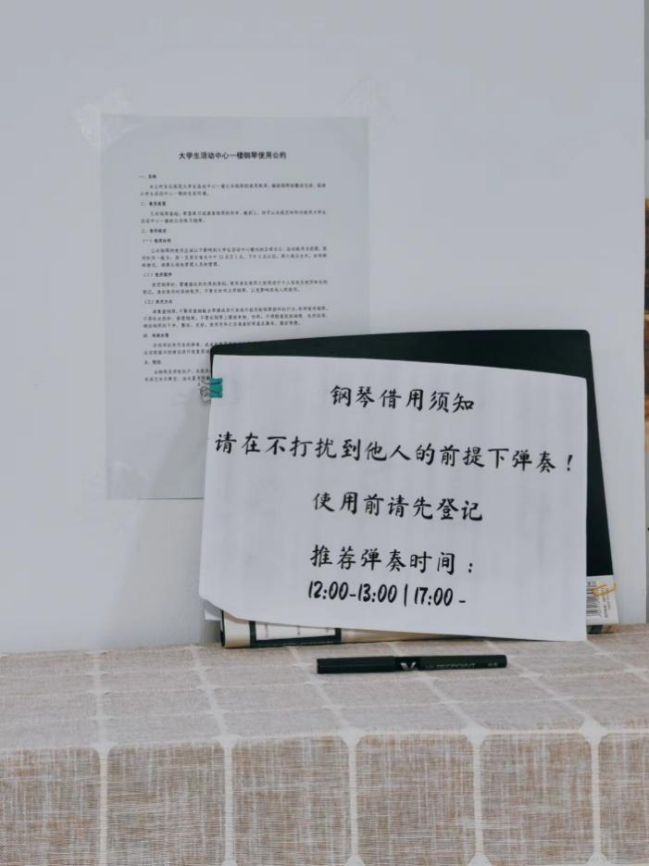 为了更好地使用钢琴,2023级本科生曹天涵与其他3位兄弟公司的同学自发发起、讨论并订立了《钢琴使用公约》,自主排定弹琴时段,自觉维护钢琴完好,让校园不仅琴声悠扬,更井然有序。
