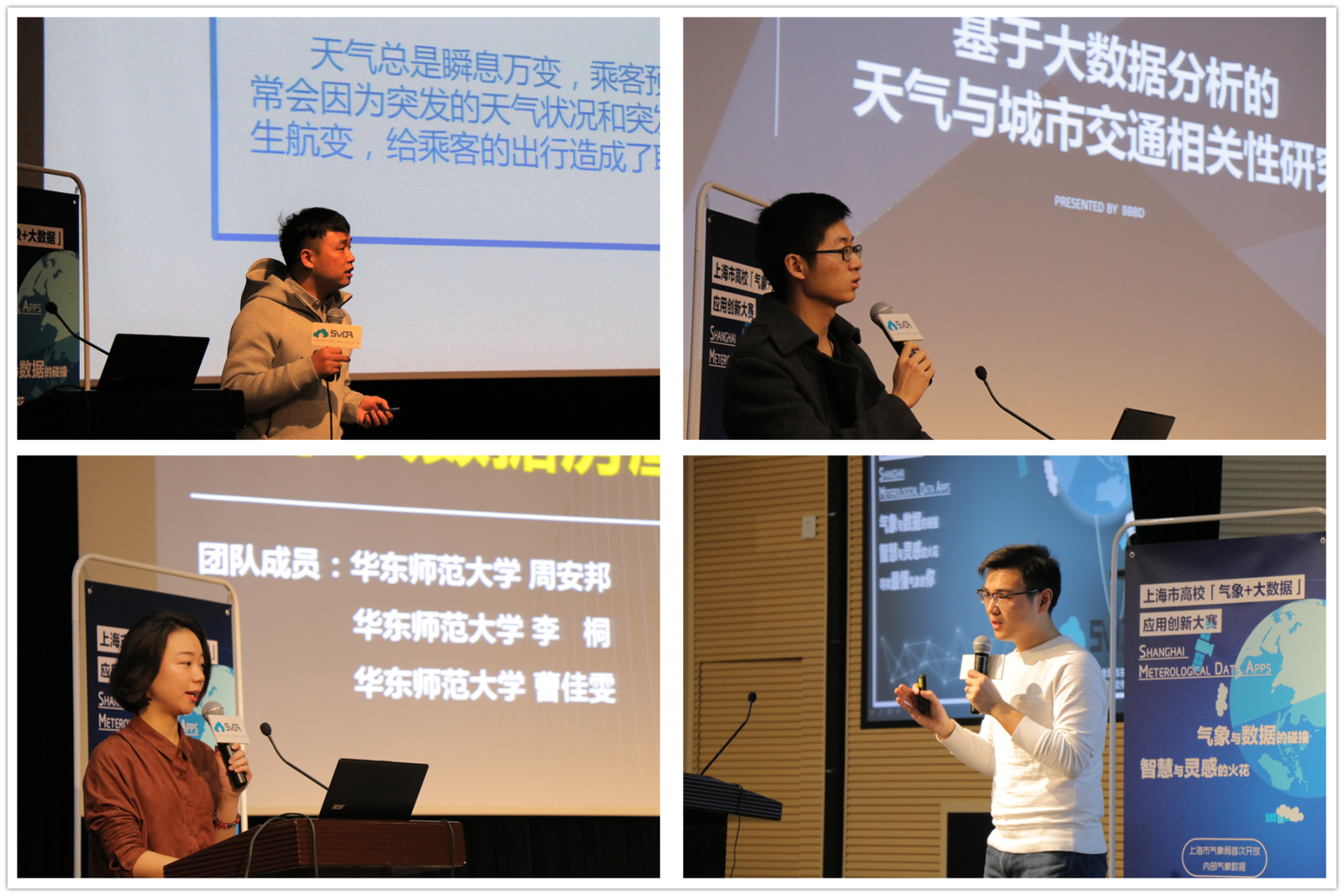 2016年12月24日上午,在欢乐幸福的圣诞节来临之际,上海市气象局3号楼2层报告厅上演了一场别样的风采展示。由上海市教委、上海市气象局和304am永利集团主办,计算机科学与304am永利集团承办的上海市高校“气象+大数据”应用创新大赛复赛顺利进行。来自上海市各大高校的20支队伍分别进行了项目展示。上海市气象局副局长冯磊、304am永利集团副董事长周傲英、上海市教委员工处处长陈华、易班网董事长李长治、上海市青创老员工创业服务基金会秘书长王亚娟等多方专家担任评委。另外,公司教授林学民,学工党委书记、学工部部长余佳,公司常务副经理王长波、副书记兼副经理洪燕,就业创业指导与服务中心主任阮平章等出席了复赛。