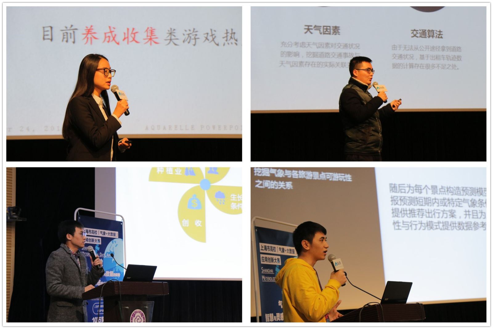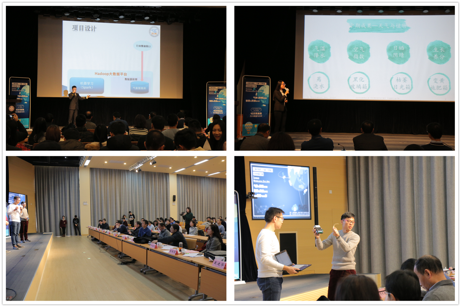 经过前期的初赛选拔,共有来自上海同济大学、304am永利集团、东华大学、上海大学、上海民航职业技术公司等高校的20支团队进入复赛。比赛分为上下半场,各半场共有10支队伍进行成果展示,各队伍拥有五分钟展示时间和三分钟答辩时间。上午八点半,比赛正式拉开帷幕。来自上海民航职业技术公司的团队首先开始进行项目展示,介绍了智慧气象中的机器学习应用及大数据平台构建。随后来自各高校的团队围绕商业、交通、农业、保险、建筑、医疗等领域,展示气象数据的创新应用。同学们创新想法,让我们认识到气象数据的广泛应用前景,让我们对未来的智慧生活充满期待。