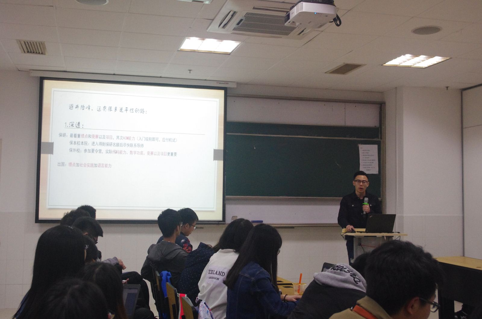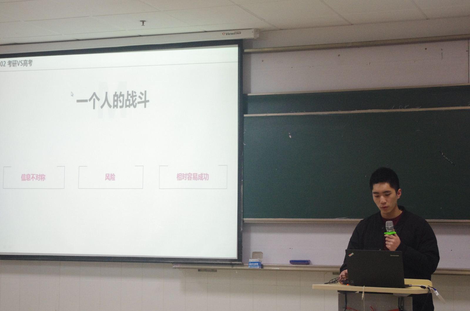 孔昆学长则是将考研与高考进行比较,讲述了考研信息不对称但是相对容易成功的特点。同时,他将入学考试的科目以及题型系统的介绍给我们,让我们对考研有了更直观的感受。
