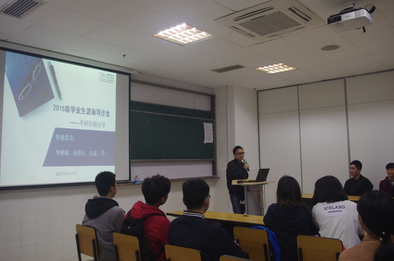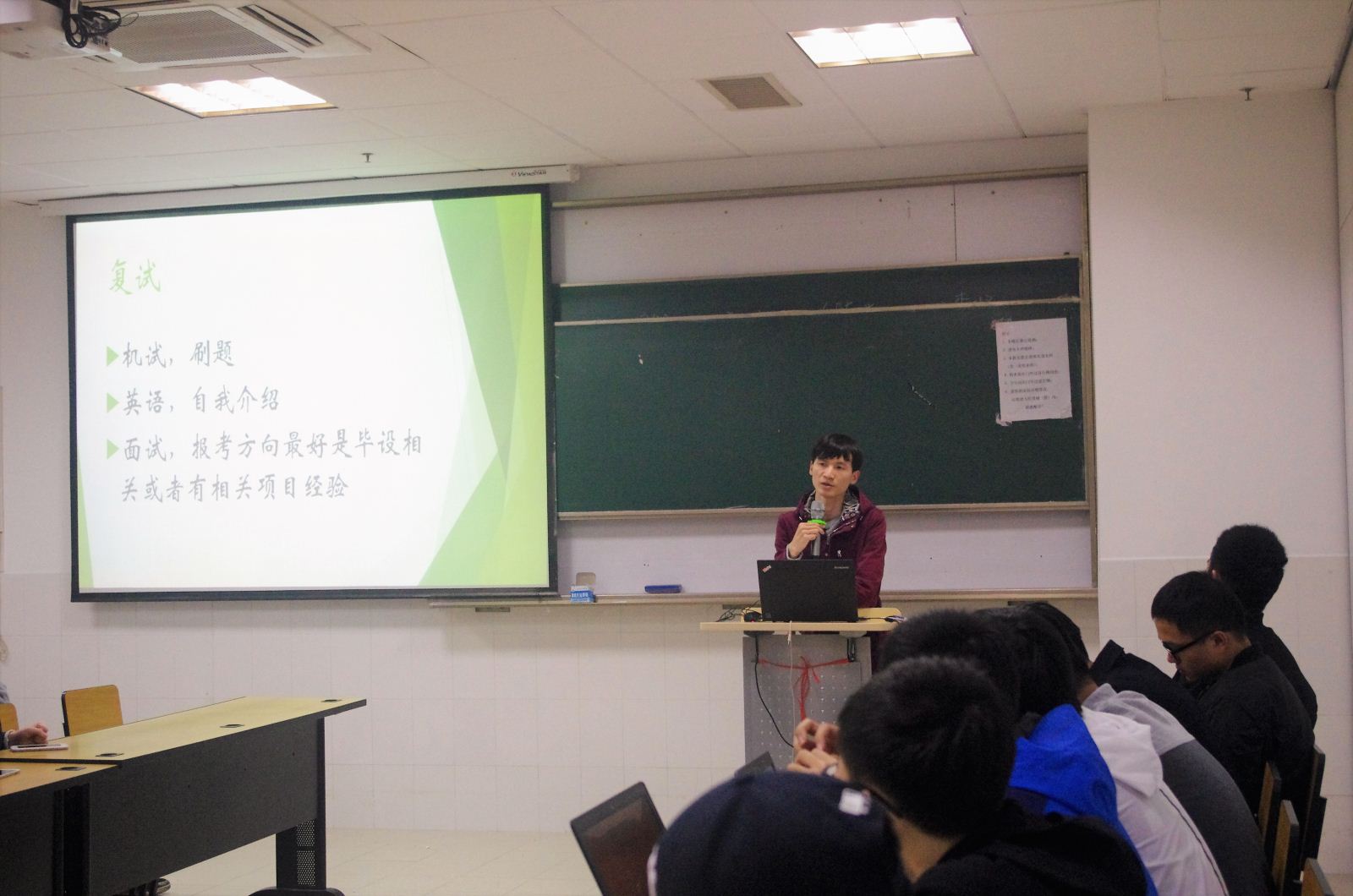 2013级的李树楠学长对于考研有着深刻并且独到的见解。他围绕着“跨专业考研”这一热点问题,详细地讲述了如何进行专业选择,想要跨考需要做哪些准备,以及如何选择公司等问题。同时,他也将自己的考试经历分享给我们,初试越早准备越好,尽量按照自己的节奏来,调整好自己的心态,在面试的时候一定要有相关的项目经验才能在众人当中脱颖而出。2013级的另一位学长祝朝凡,他为大家系统的介绍了如何准备考研初试,怎样面对本校这样特殊情况进行准备,令同学们受益匪浅。