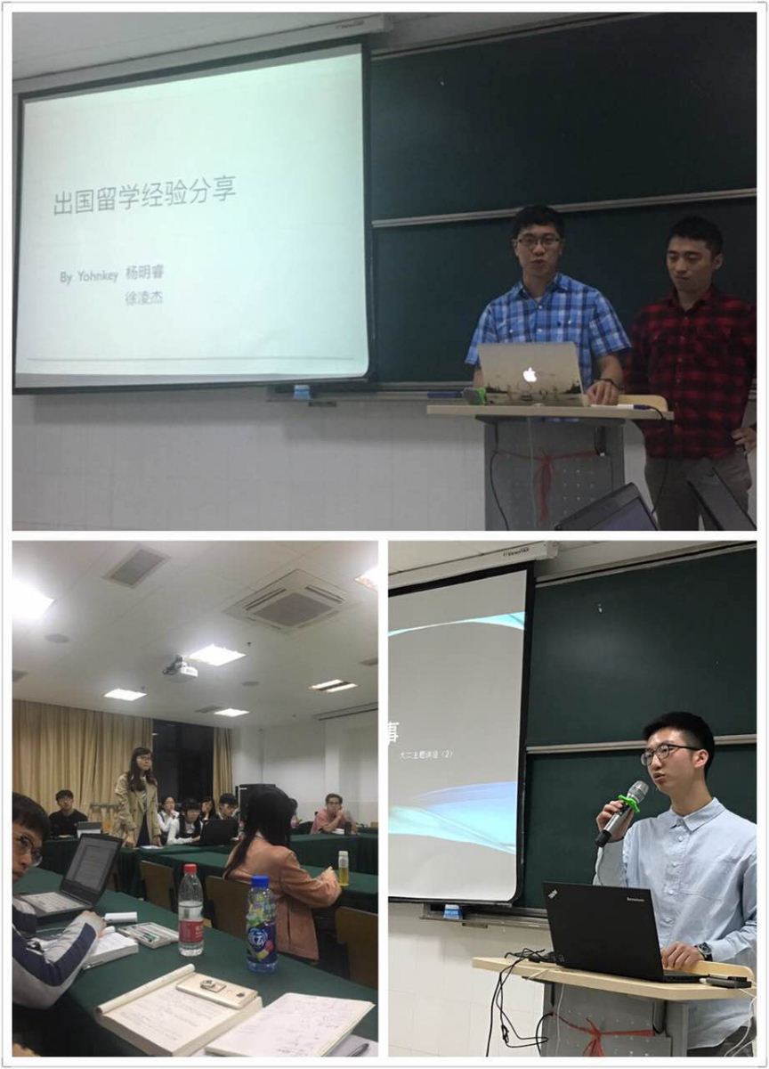 杨明睿学长、徐凌杰学长共同为同学们分享了关于出国留学的整体流程,系统地分析了其中的每个部分。准备的时间、公司考虑的硬性条件、考试的提醒与训练方式、以及其他需要的各种材料等。学长们还介绍了如何结合自身的情况考虑申请过程,使同学们对于自己的打算有了更明确的规划。