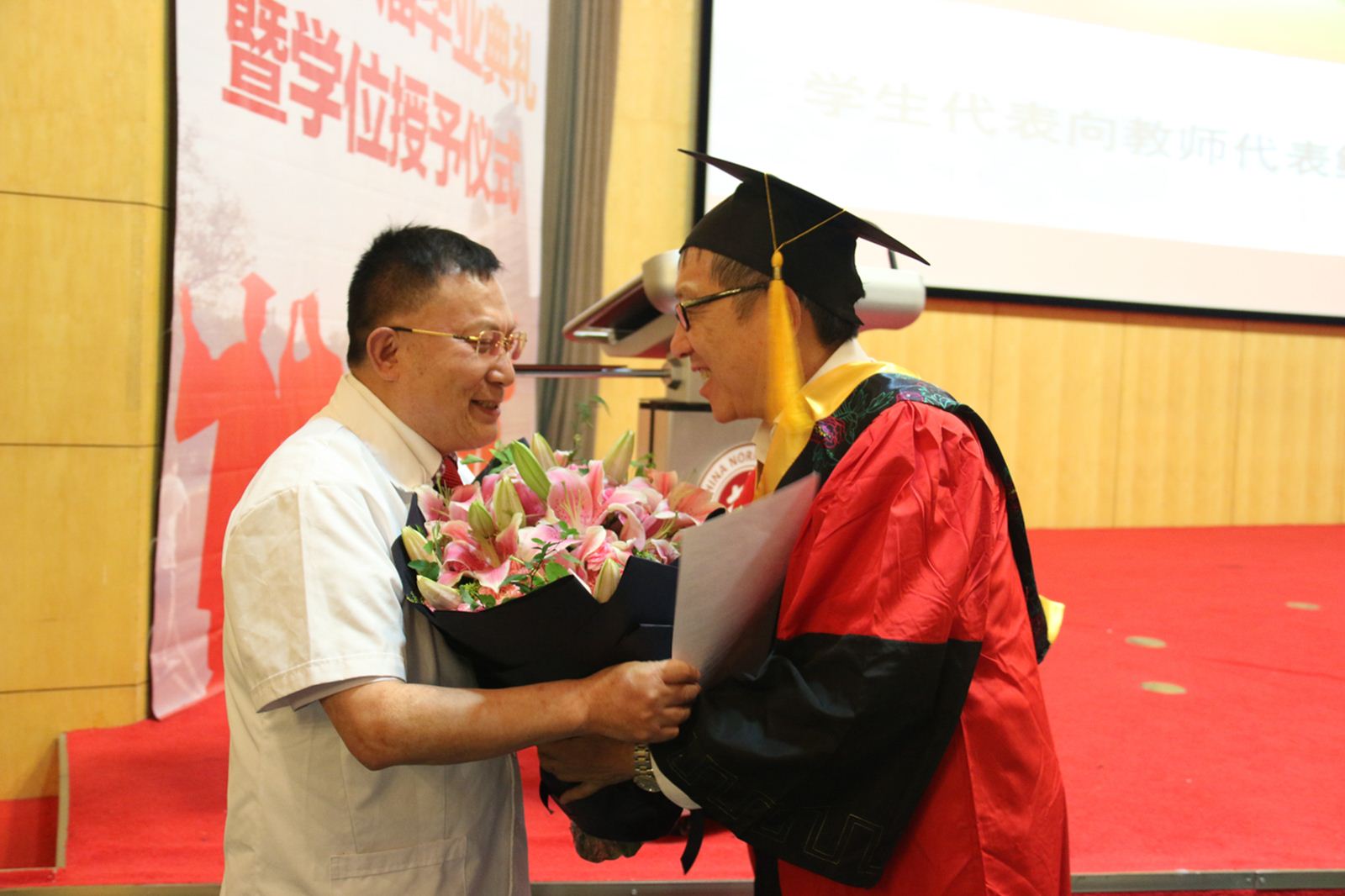 悠悠寸草心,师恩永难忘。典礼上,各班级的毕业生代表为教师代表献上了美丽的鲜花,表达对老师们多年培育的感恩之情。
