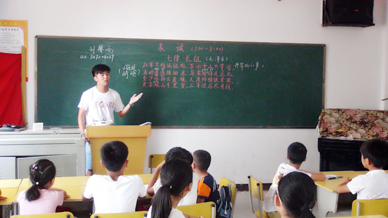 清晨,朗朗书声伴随着呖呖鸟鸣,唤醒了还在沉睡中的公司,假期中公司里怎会有书声传来?走近教室,原来是暑期支教志愿者刘馨雨正带领着大家朗读《七律·长征》,“红军不怕远征难,万水千山只等闲…”孩子们诵读之声洋洋盈耳,和支教的志愿者们一起开启了今天的学习专列。