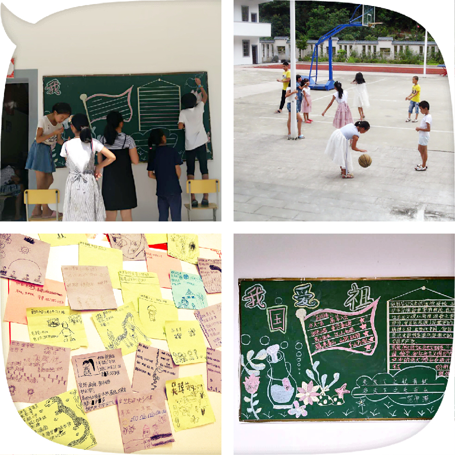 课余时间,孩子们生活同样精彩万分,他们时而在黑板报上“指点江山”,时而在球场上“快步流星”,时而在纸上“画蛇添足”。志愿者与营员们一同欢声笑语,意犹未尽。