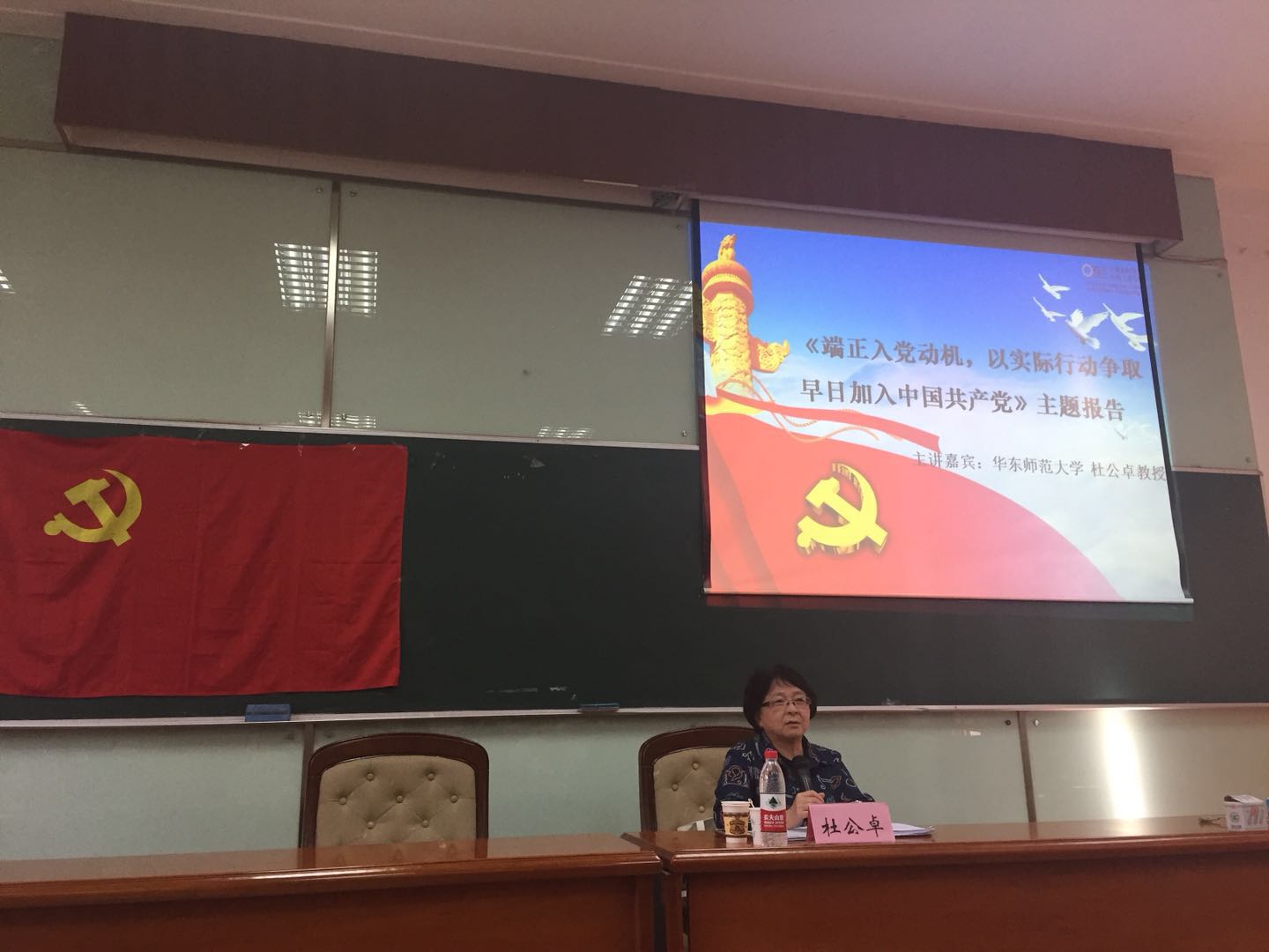 报告在同学们热烈的掌声中开始,杜公卓教授着重从“为什么要强调入党动机”,“在老员工中发展党员的重要性”和“怎样争取入党”三个方面展开报告。杜公卓教授指出入党最重要的问题就是入党动机。强调入党动机,从根本上来说是为了保证党员质量,保持党组织的先进性和纯洁性,提高党的战斗力和凝聚力。杜公卓教授指出现如今的执政环境越来越复杂,腐败等恶劣现象层出不穷。如果党员带着在关键时刻经受不住考验、起不了作用,就无法巩固执政党的执政地位。