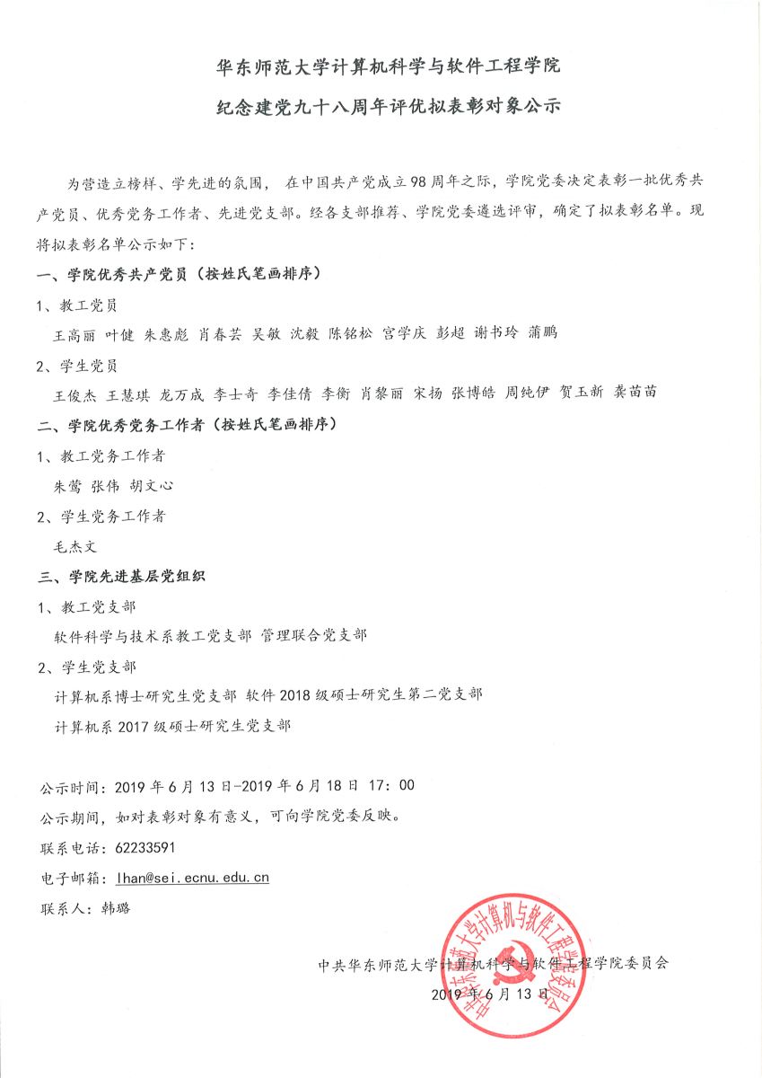 304am永利集团计算机科学与304am永利集团 纪念建党九十八周年评优拟表彰对象公示