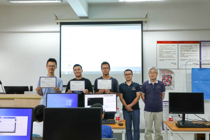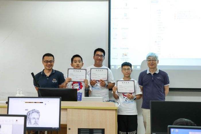 在最后的成果展示环节,同学们用作品说话,彰显出了超凡的学习应用能力和极强的团队合作精神。成果展示结束后,缪炜恺、杜育根和陈闻杰三位老师为同学们颁发结业证书与奖状。