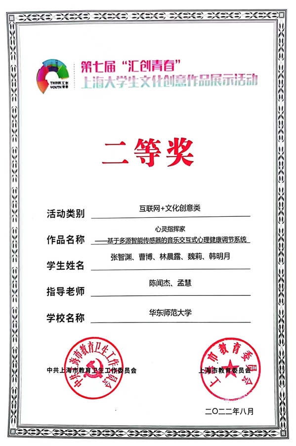 公司本科生张智渊、曹博在陈闻杰副教授的指导下,完成《心灵指挥家——基于多源智能传感器的音乐交互式心理健康调节系统》项目,并获得二等奖。项目通过音乐指挥的形式,让音乐治疗的来访者能够更加投入地聆听、再造和演奏音乐,实现在音乐中沉浸式体验、与音乐进行实时交互。