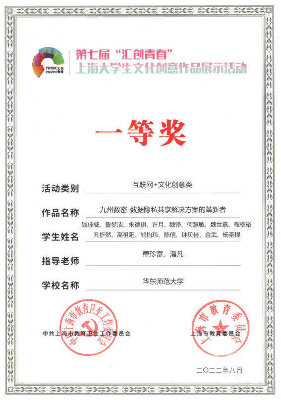 在曹珍富教授的指导下,由“九洲数密”团队完成的《九州数密-数据隐私共享解决方案的革新者》项目在本次活动中获得一等奖。团队致力于解决数据共享下的隐私保护,提出了独家技术——双重后量子密钥封装技术,突破隐私计算中的密文四则运算和抗量子密码两大难题,实现了通讯带宽低、速度快和抗量子安全的一套封装技术,在行业内处于技术领先地位,得到了一系列国家权威机构认证,并应用在银行风控系统、政府社保外包计算、电商部门之间数据共享等场景,开展多个创新试点合作,取得积极成效。该项研究成果打破了国外对于数据隐私保护行业的技术垄断,对于助力国内产业升级、为国家数据安全保驾护航具有较强实际意义。