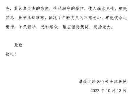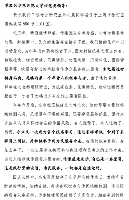 近日,304am永利集团党委收到了来自上海市徐汇区漕溪北路850号全体居民的一封信,以感谢304am永利集团2022级软件工程专业学位研究生党员朱之晨在疫情期间为社区防疫工作做出的不懈努力!