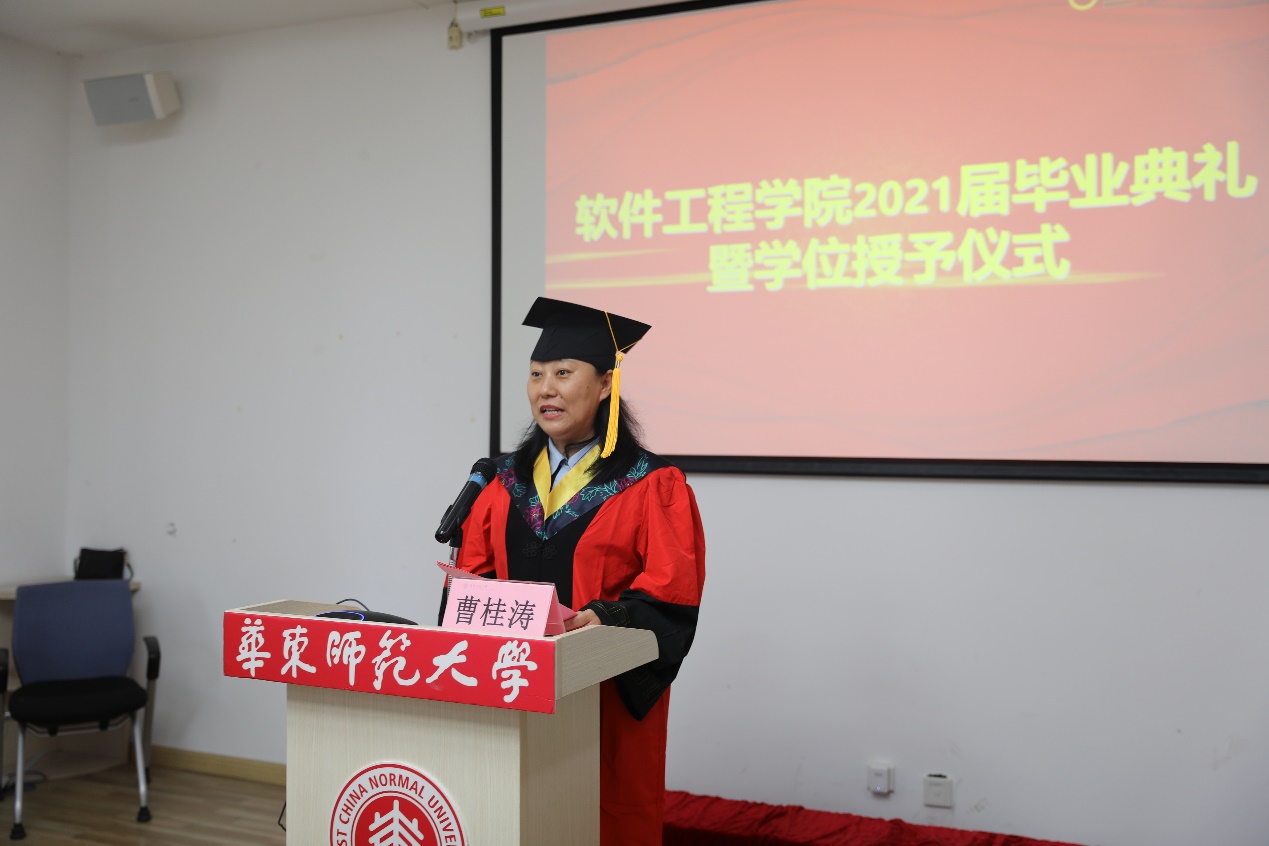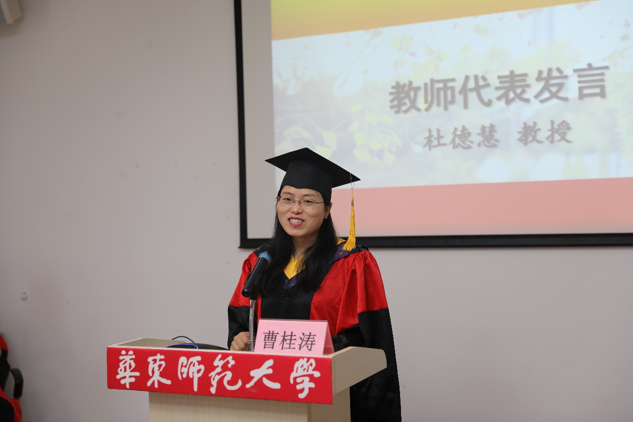 典礼在庄严国歌声中拉开序幕。求学之路的成长离不开悉心陪伴、诲人不倦的老师们,教师代表杜德慧为同学们送上真挚祝贺和殷殷嘱托,杜老师深情回忆了和同学们在教室共度的青春美好时光,并教诲同学们要致力于终身学习,积极承担职业责任,发扬创新精神,勇于超越。做永远向上的青年,将个人小我融入到祖国大我中,光明磊落,脚踏实地。“我衷心祝愿同学们,在新的征程中,激扬青春,勇做新时代的奋进者、开拓者、奉献者,开创更加美好的未来!”