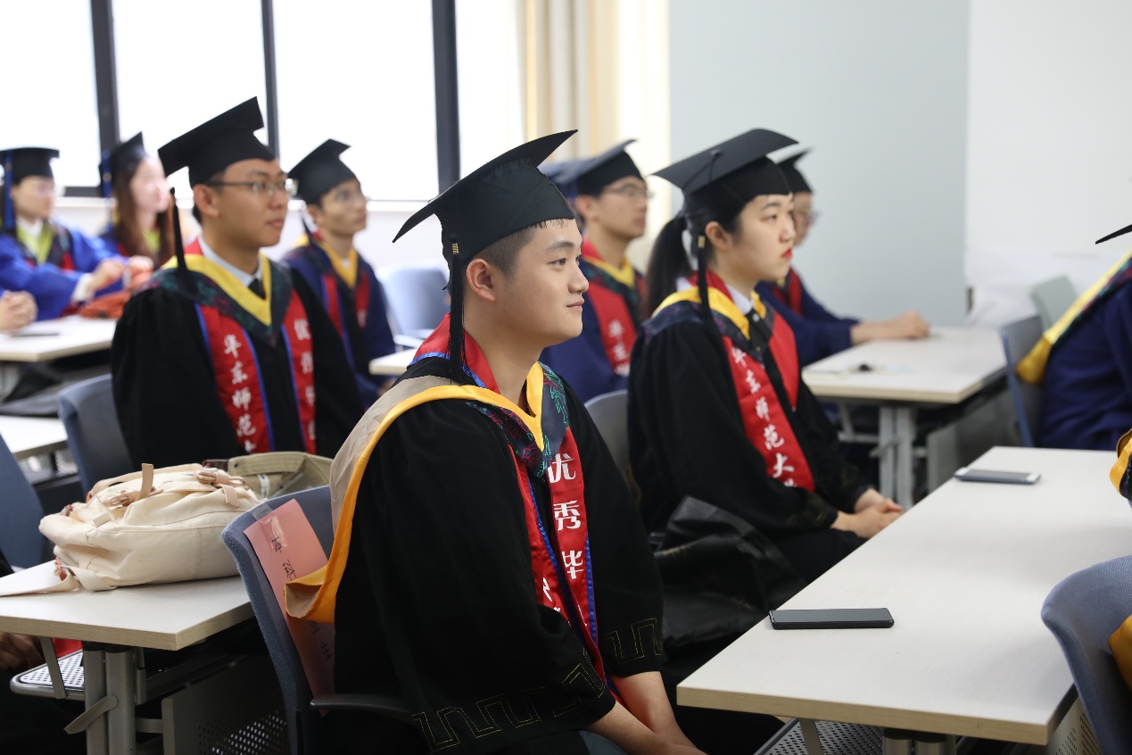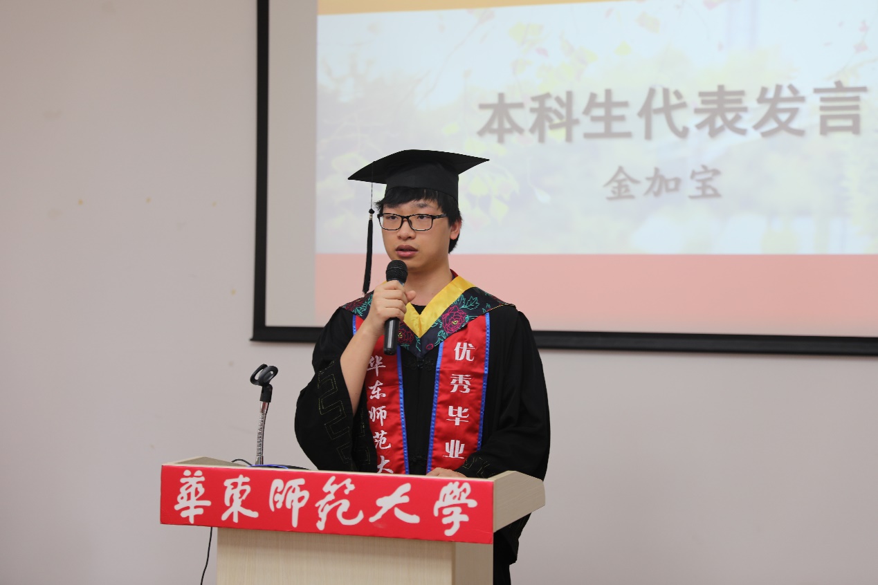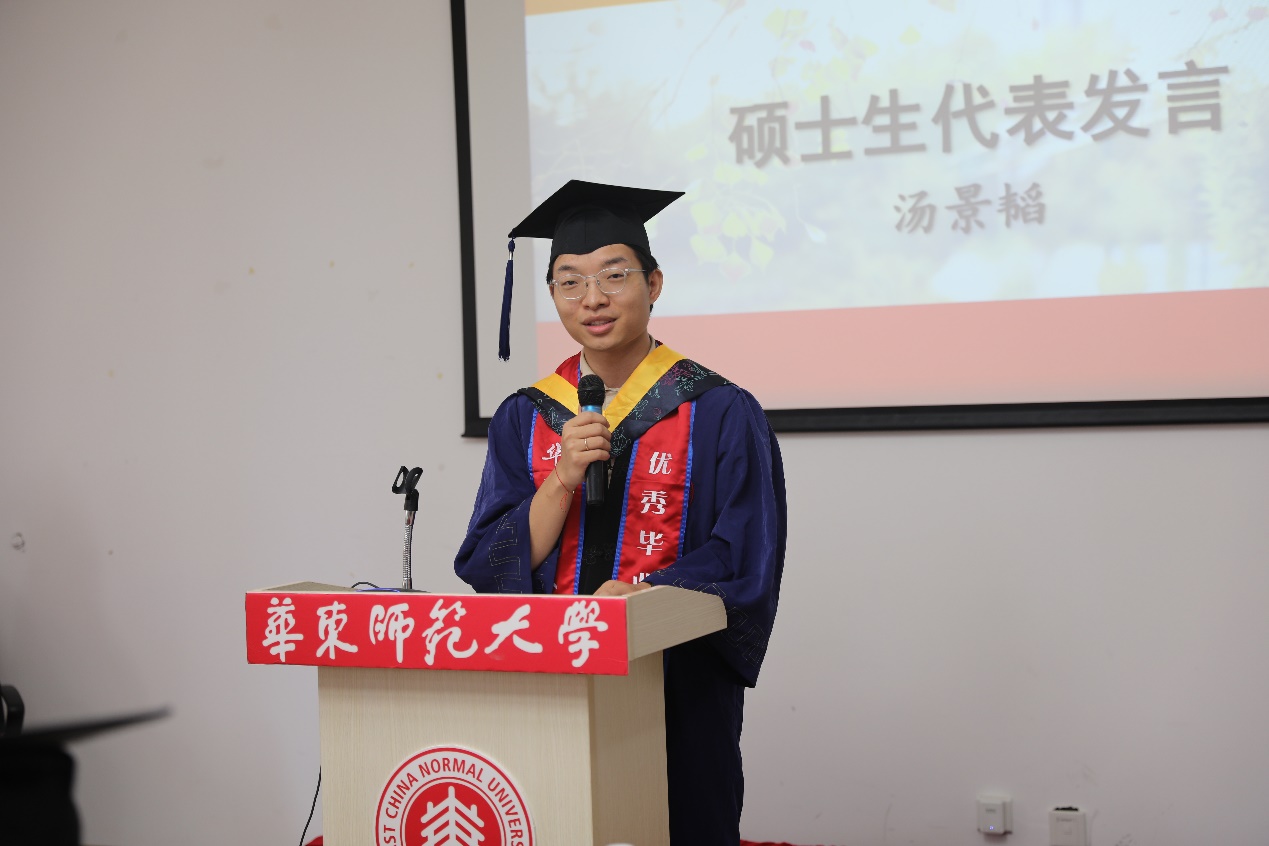 研究生代表汤景韬感谢全体老师的付出使得大家可以顺利完成学业,一路走来多姿多彩的日子令他收获颇丰,老师在科研和生活上敬业、严谨的治学态度都给予了他深厚的影响,作为毕业生的同辈,他对同窗送上了真诚祝福。“‘求实创造,为人师表’的八字校训,我将在往后的学习生活中铭记于心,确保求实事求真理,争取创新事造新梦,倘若有机会做老师,也必将尊师重道,为人师表!”