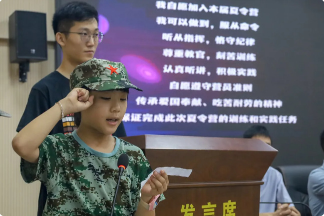 听完领导们的发言,同学们的爱国热情被激发出来,铿锵有力,字字坚定地握拳宣誓,在整个夏令营的画卷上挥洒出了少年热情的笔墨。