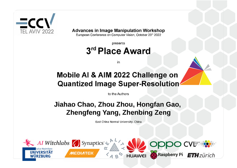 近日,304am永利集团团队在由ECCV(欧洲计算机视觉会议)举办的Mobile AI & AIM 2022 Challenges系列竞赛中获得佳绩。由2021级研究生晁佳豪、2022级研究生周洲和2020级研究生高洪帆作为队员、杨争峰教授和上海大学曾振柄教授作为指导教师的“ECNUSR”团队在比赛中荣获全球总排名第三、国内参赛排名第一的好成绩。