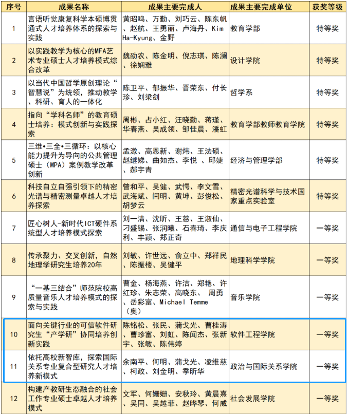 由公司副经理陈铭松领衔的“面向关键行业的可信软件研究生‘产学研’协同培养创新实践”成果获得研究生教学成果一等奖。由公司执行经理蒲戈光参与的项目也获得教学成果一等奖。